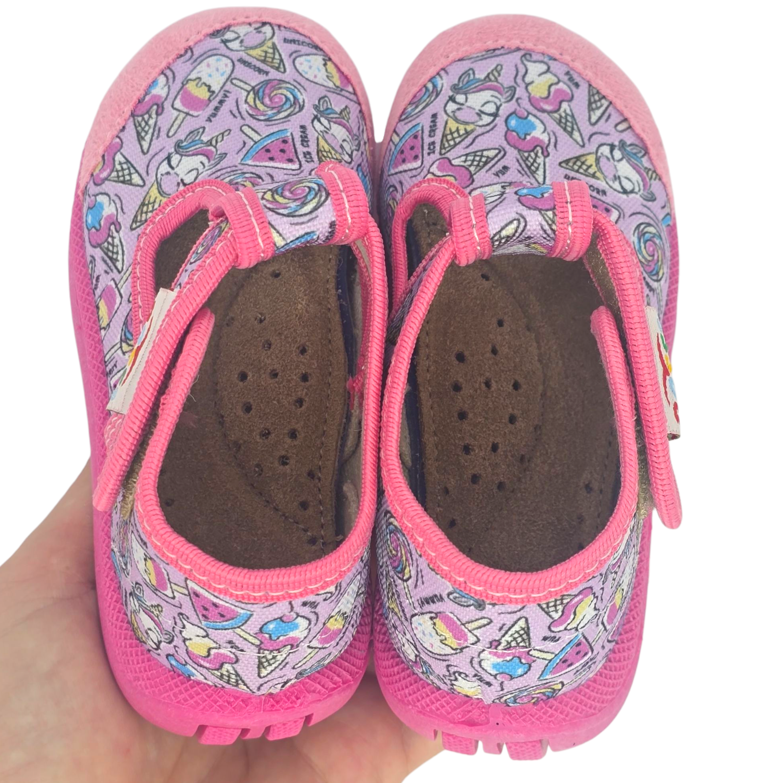 Foarte fain si calitativ sunt in regula.Pana la urma urmei sunt niste papucei pentru joaca, nu ma astept sa tina mult, dar important este ca are aceea taloneta pt preventie platfus. Foarte incantata!
