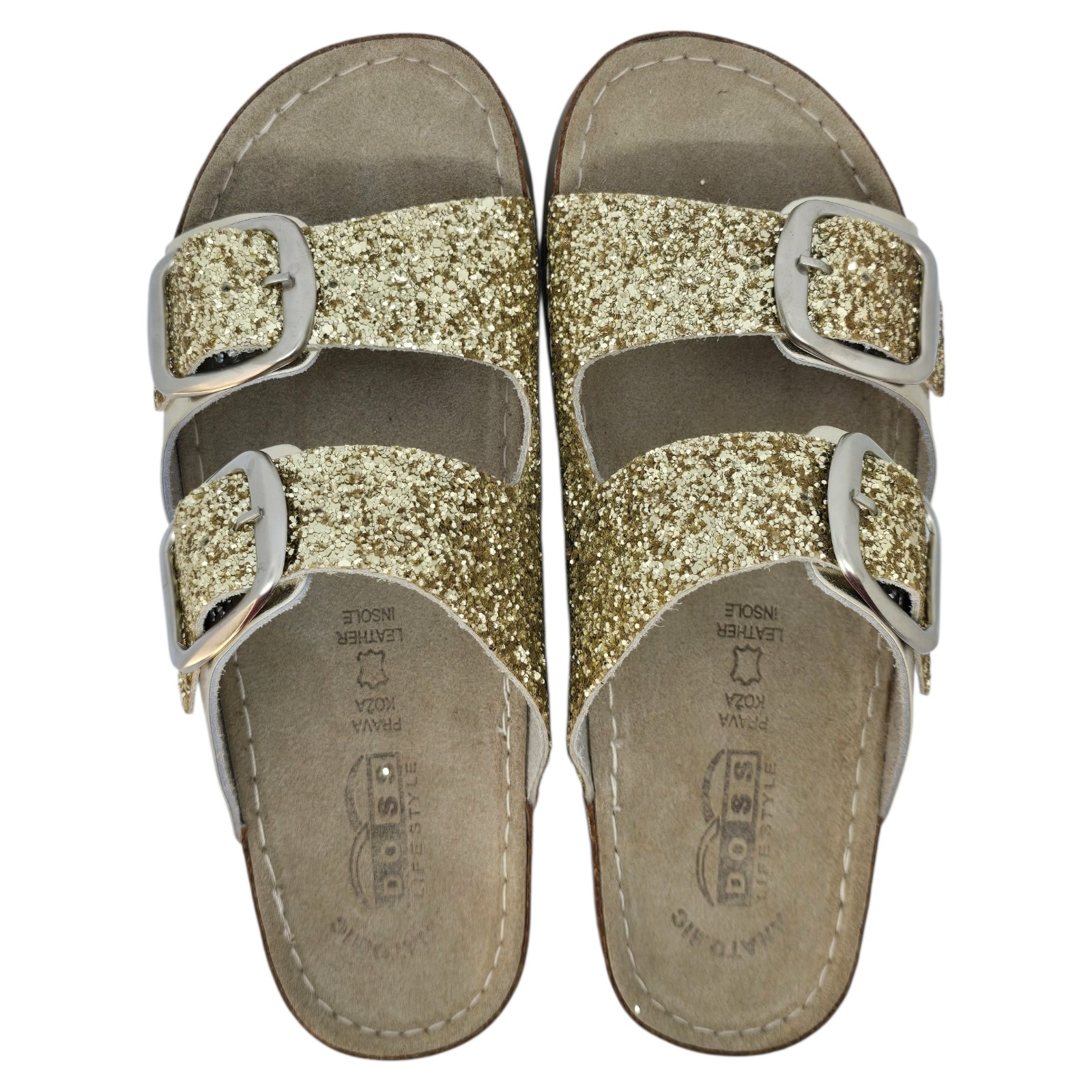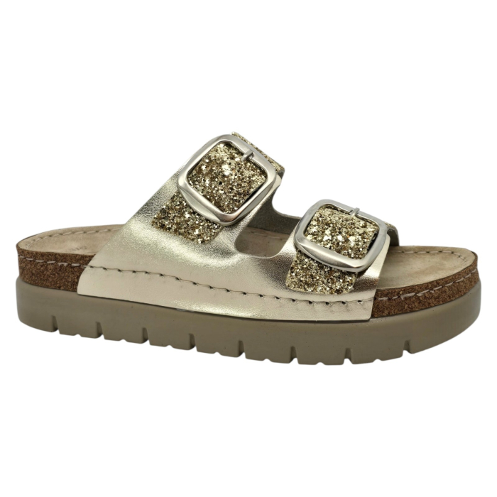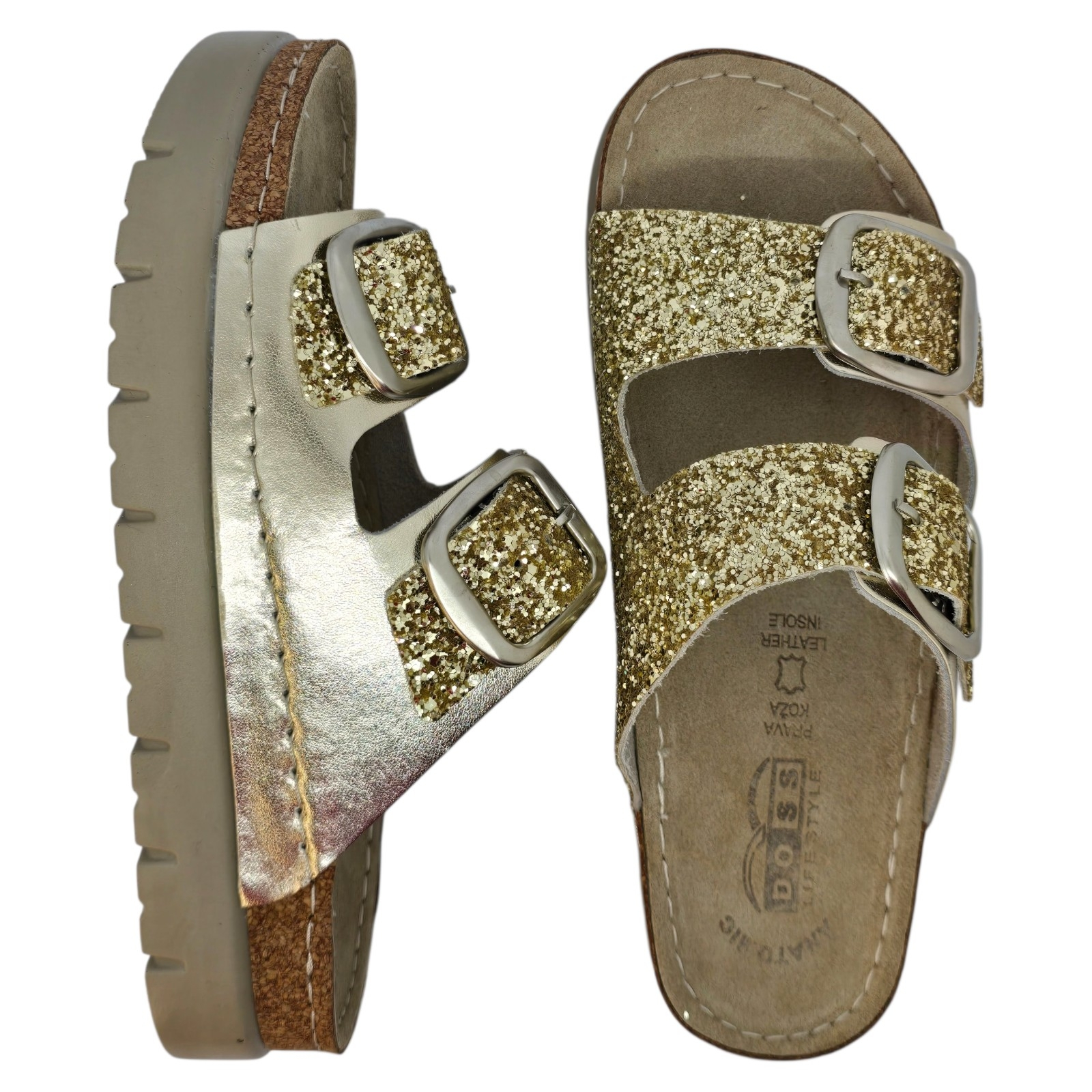 Papucii marca Doss model 689 de culoare aurie cu sclipici este destinat persoanelor care cauta un echilibru perfect intre confort si calitate. Realizati dupa forma anatomica a piciorului acesti saboti ofera suport optim picioarelor obosite si solicitate, fiind o solutie ideala, atat in cadrul activitatilor profesionale, cat si in cele de zi cu zi.