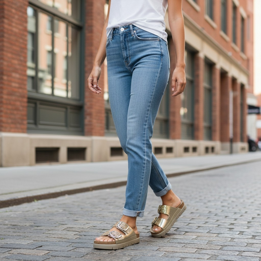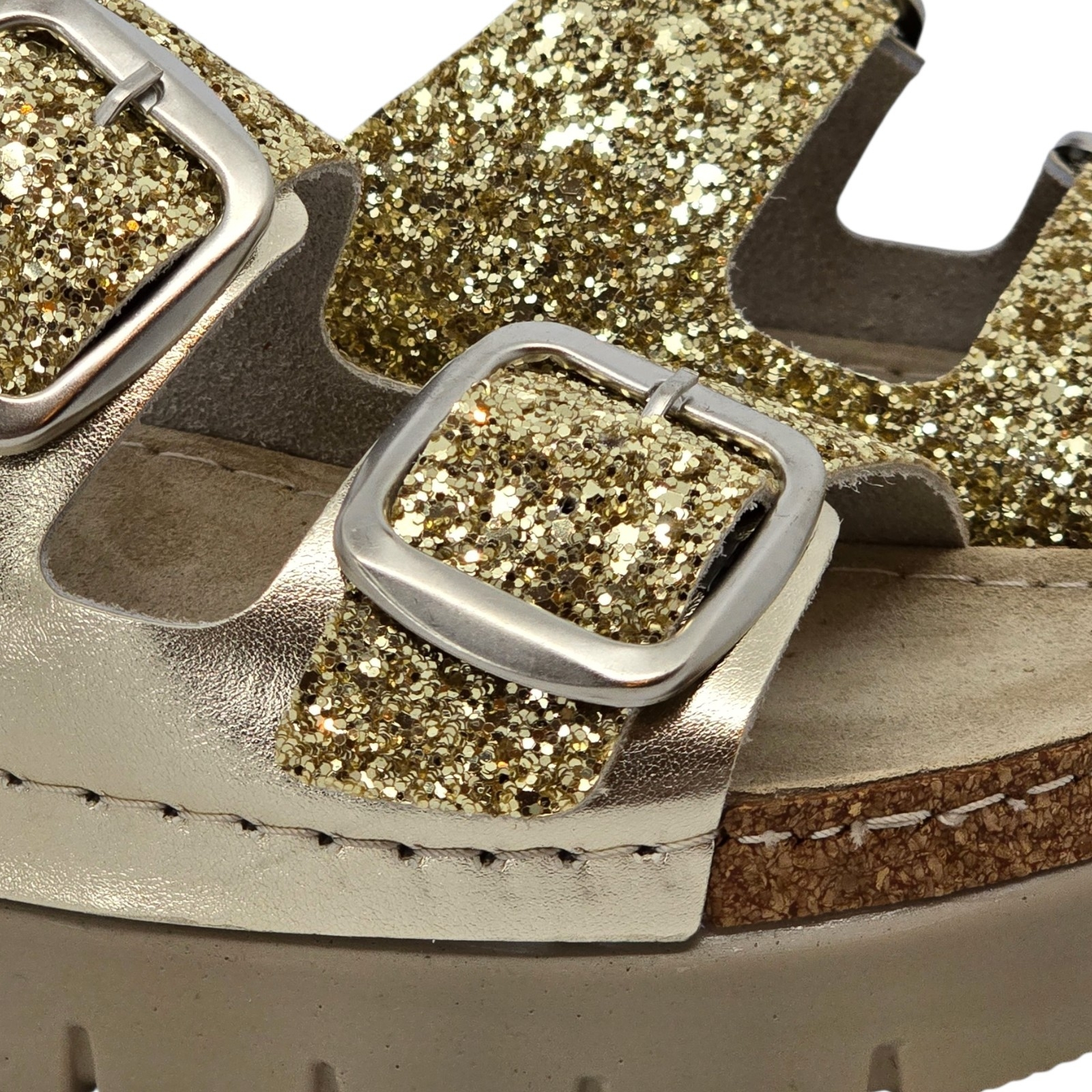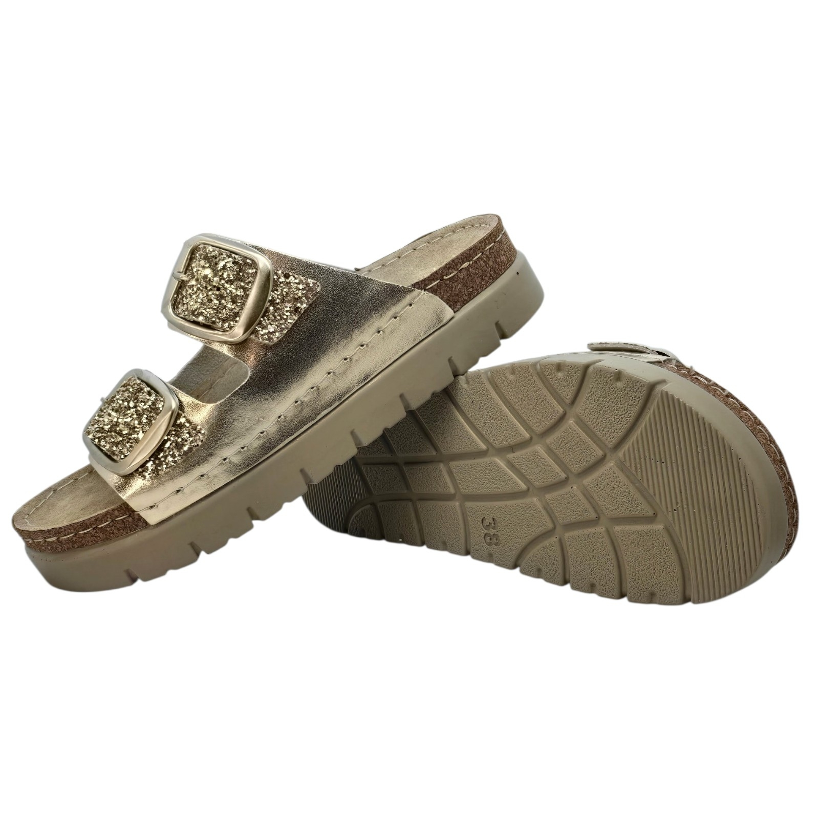 Papucii marca Doss model 689 de culoare aurie cu sclipici este destinat persoanelor care cauta un echilibru perfect intre confort si calitate. Realizati dupa forma anatomica a piciorului acesti saboti ofera suport optim picioarelor obosite si solicitate, fiind o solutie ideala, atat in cadrul activitatilor profesionale, cat si in cele de zi cu zi.